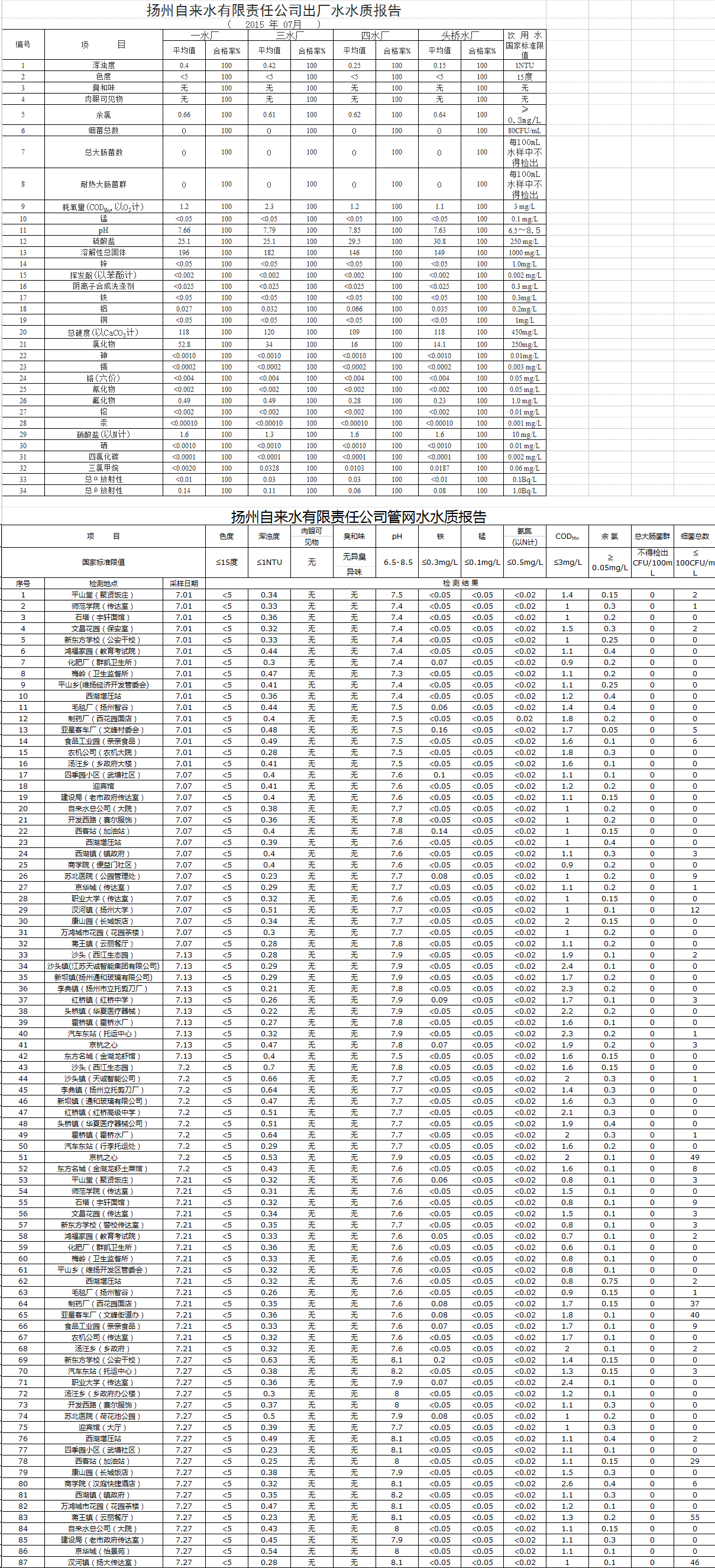 自來水水質(zhì)報(bào)告(2015年7月份)
