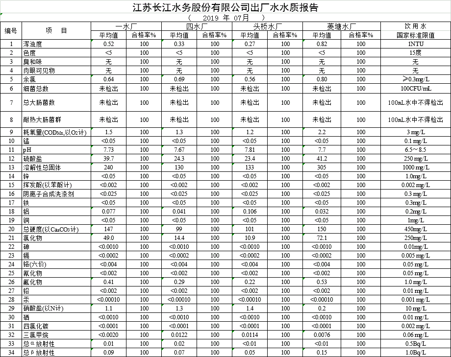 自來水水質(zhì)報告(2019年7月份)