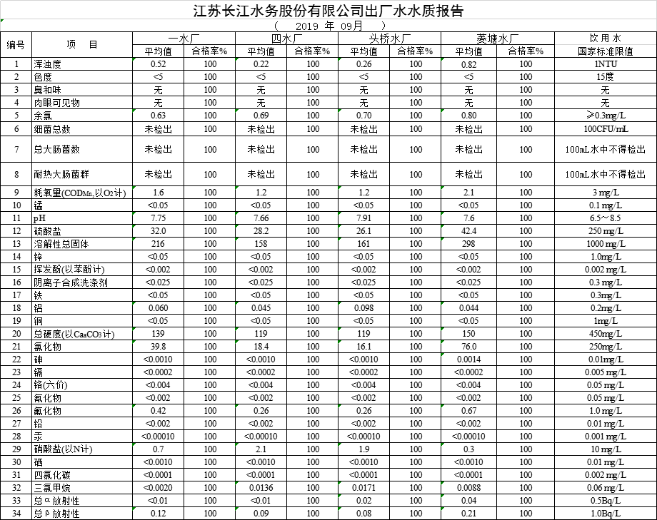 自來(lái)水水質(zhì)報(bào)告(2019年9月份)