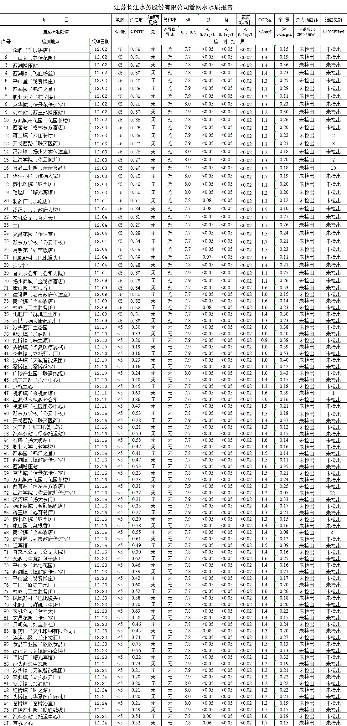 江蘇長江水務股份有限公司管網(wǎng)水水質(zhì)報告(2019年12月)