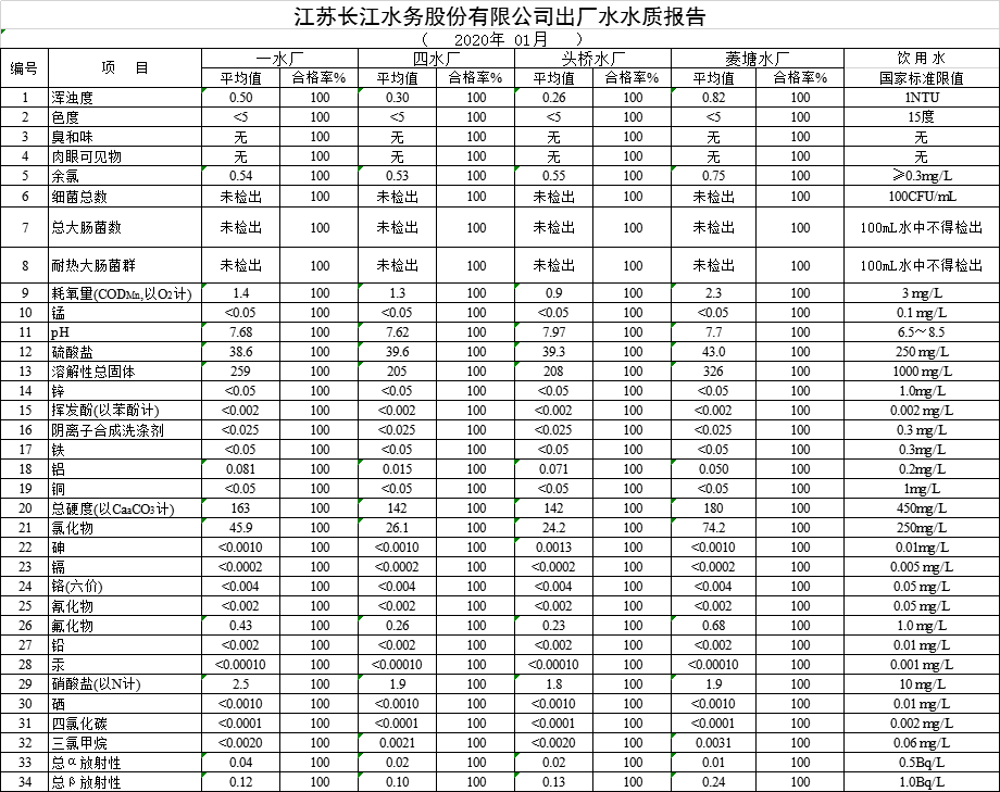 自來水水質(zhì)報告(2020年1月份)