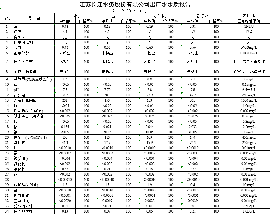 自來(lái)水水質(zhì)報(bào)告(2020年4月份)