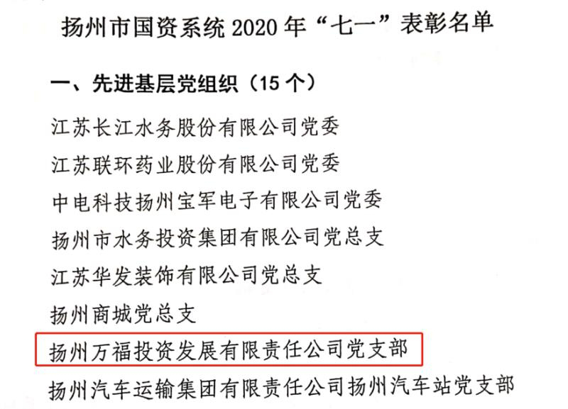 近日,萬福公司黨支部榮獲2020年揚州市國資委“先進基層黨組織”榮譽稱號。此項榮譽的取得不僅僅是揚州市國資委對萬福公司黨支部基層黨組織創(chuàng)建工作的充分肯定,也是對全體萬福人努力拼搏的最好褒獎。