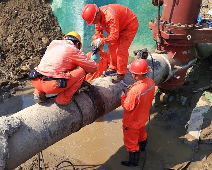 在不間斷施工的10小時(shí)過程中,先后完成管道斷管、焊接、新舊管道碰接,恢復(fù)新管道供氣全過程施工,確保了棲月苑小區(qū)、潤揚(yáng)中學(xué)和清華園小區(qū)的晚餐正常用氣。