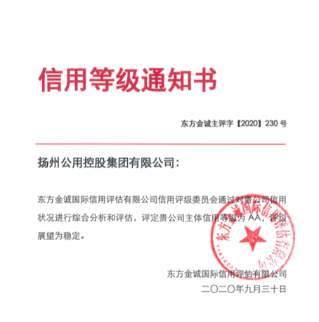 9月30日,經(jīng)東方金誠(chéng)國(guó)際信用評(píng)估有限公司評(píng)級(jí)委員會(huì)最終審定,給予揚(yáng)州公用控股集團(tuán)有限公司AA主體信用評(píng)級(jí),評(píng)級(jí)展望為穩(wěn)定。