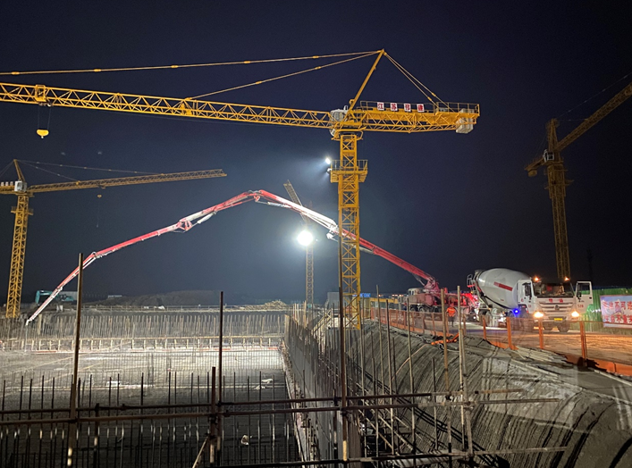 本次澆筑底板的AAO生化池池體規(guī)模大,澆筑難度系數(shù)高。為確保澆筑工作順利進(jìn)行,澆筑前參建各方多次召開施工專題會(huì)議。針對(duì)此次混凝土的澆筑方法、澆筑注意事項(xiàng)、混凝土強(qiáng)度及配合比要求等編制了詳細(xì)的施工方案,并對(duì)施工過程中可能出現(xiàn)的問題制定了應(yīng)急預(yù)案。澆筑期間,管理人員實(shí)行“兩班倒”,全程監(jiān)督旁站,嚴(yán)控澆筑質(zhì)量。最終,全體人員克服了場(chǎng)地受限、夜間施工道路濕滑等重重困難,保安全優(yōu)質(zhì)量,AAO生化池一號(hào)片區(qū)混凝土底板澆筑工作按既定工期順利完成。
