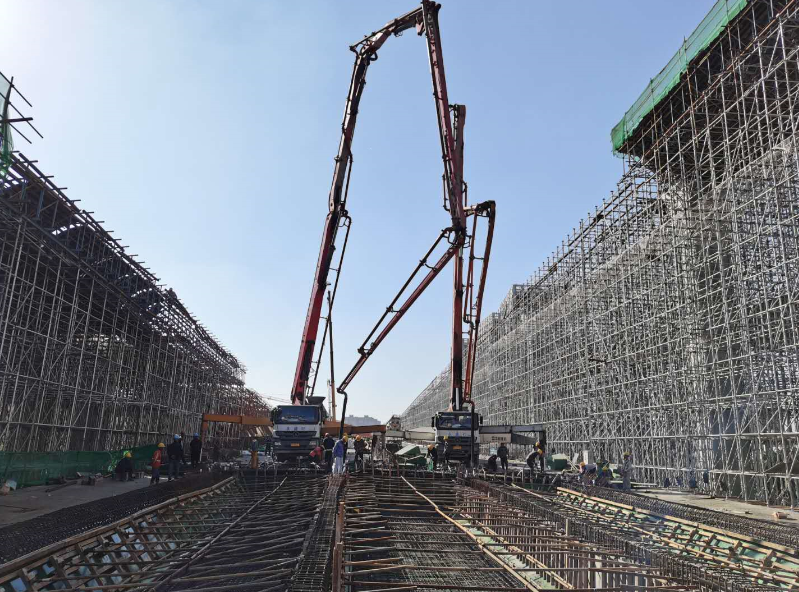 為保證項目工期,項目部統(tǒng)籌兼顧,積極謀劃,在保證橋面附屬工程施工的同時,也保證了箱梁施工工作的穩(wěn)步推進。每一次澆筑前,對施工班組進行質量安全技術交底,嚴格過程控制和工序銜接,確保工程質量;現(xiàn)場施工嚴格按照專項方案,現(xiàn)場技術負責人對每道工序進行嚴格審核,牢牢把關,以“高標準,嚴要求”進行每道工序的驗收;項目成立黨員先鋒隊和青年突擊隊,黨員領導干部沖鋒在前,全體參建人員迎難而上,緊盯節(jié)點,細化措施,落實責任,強力推動工程順利進展;同時,現(xiàn)場施工人員積極主動爭取一切有利條件,攻堅克難,搶抓時機,多措并舉,合理配置資源,全力保障每一聯(lián)現(xiàn)澆箱梁的順利澆筑。此次主線現(xiàn)澆箱梁的澆筑完成,為項目全面進入附屬工程施工、完成整體目標任務奠定了堅實的基礎。截止日前,工程全部66聯(lián)現(xiàn)澆箱梁,已澆筑61聯(lián);支架已全部搭設完成;附屬工程防撞護欄已完成9800米,完成64.1%;橋面鋪裝已完成48聯(lián),完成64%;正在進行瀝青攤鋪準備工作,各工序施工正穩(wěn)步推進中。