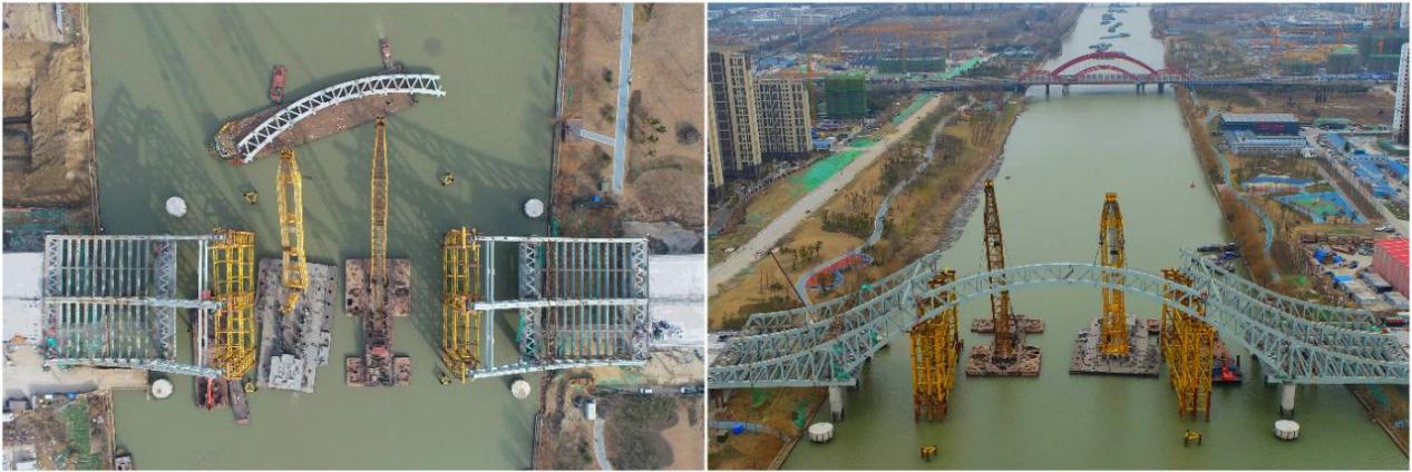 跨京杭運河大橋拱肋部分的合龍段共有三節(jié),其中含兩節(jié)對稱的邊拱中跨合龍段,一節(jié)中拱中跨合龍段。本次吊裝的是跨京杭運河大橋合龍段的首節(jié),長82.2米,高17.4米,重282.4噸。截至目前,項目主體工程已完成65%。