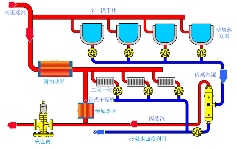 來自薄層蒸發(fā)器的疏水閥排出的高溫、高壓冷凝水全部進(jìn)入閃蒸罐進(jìn)行閃蒸分離,產(chǎn)生的閃蒸蒸汽進(jìn)入預(yù)加熱器,預(yù)加熱器對帶式干燥機(jī)內(nèi)循環(huán)空氣進(jìn)行加熱,當(dāng)溫度不能滿足生產(chǎn)要求時,開啟再加熱器對循環(huán)空氣進(jìn)行再次加熱。閃蒸罐分離后的冷凝水通過底部疏水閥與預(yù)加熱器排出的冷凝水匯合后排入現(xiàn)有蒸汽冷凝水箱。閃蒸罐上設(shè)置安全閥,當(dāng)系統(tǒng)異常,安全閥打開泄壓。