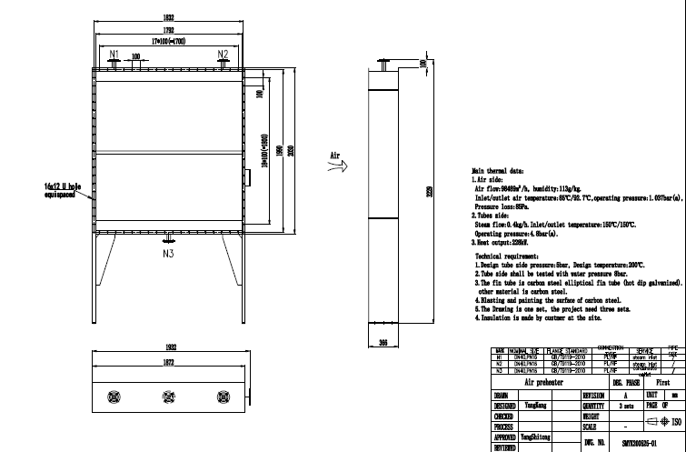 1 | 預(yù)加熱器 | 按現(xiàn)場接口、尺寸要求進(jìn)行訂制。殼程:熱空氣,98489m3/h,溫度<92℃;管程:蒸汽,0.4kg/h,溫度<150℃,壓力<4.8bar | 凱絡(luò)文、雙木、林德 | 臺 | 1 |