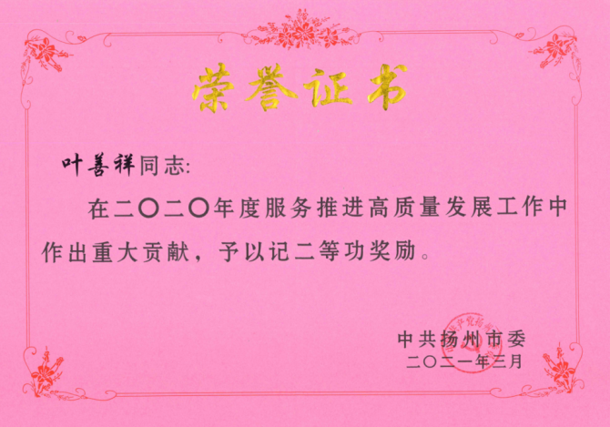 3月31日,在全市高質(zhì)量發(fā)展總結(jié)表彰大會上,城控集團(tuán)被表彰為2020年度市級機(jī)關(guān)績效考評“一等等次單位”,這是集團(tuán)轉(zhuǎn)型發(fā)展以來連續(xù)四次、歷史第七次獲得該項殊榮。集團(tuán)黨委書記、董事長葉善祥榮立二等功。