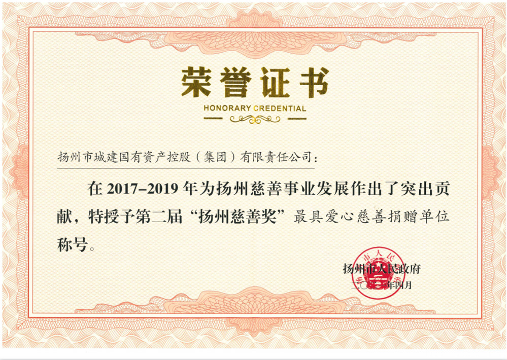 5月19日,揚(yáng)州市慈善總會(huì)成立20周年暨“大愛(ài)之城”第四屆公益慈善義演晚會(huì)在揚(yáng)州運(yùn)河大劇院舉行。晚會(huì)現(xiàn)場(chǎng),城控集團(tuán)被市政府授予第二屆“揚(yáng)州慈善獎(jiǎng)”最具愛(ài)心慈善捐贈(zèng)單位稱號(hào),被市慈善總會(huì)授予“揚(yáng)州市慈善總會(huì)成立20周年突出貢獻(xiàn)獎(jiǎng)”榮譽(yù)稱號(hào)。