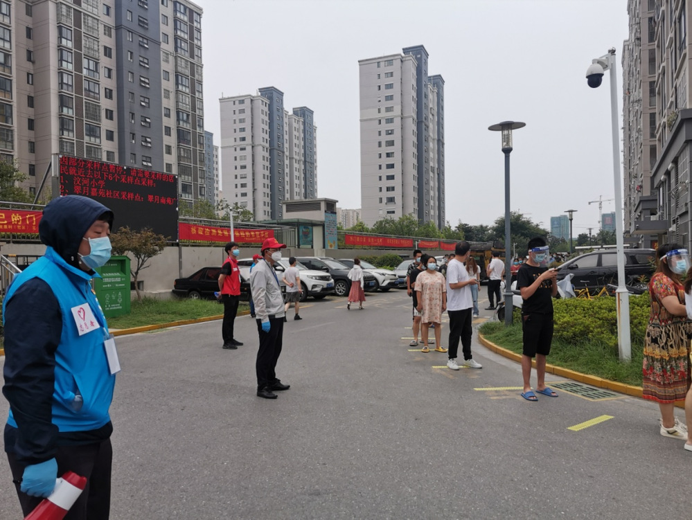 “請(qǐng)大家排好隊(duì),保持一米以上安全距離,不要造成人員聚集,請(qǐng)?zhí)崆皽?zhǔn)備好你的身份證……”志愿者不斷提醒居民注意。在翠月花園核酸采集點(diǎn),志愿者們穿梭在排隊(duì)人群中,邊安撫居民緊張情緒,邊引導(dǎo)居民即測(cè)即走?!半m然天氣很悶熱,工作量很大,但是我們有信心能保質(zhì)保量完成全小區(qū)核酸檢測(cè)任務(wù)?!彼麄儾活櫤韲邓粏?,依舊熱情且耐心地回答居民的問題,引導(dǎo)現(xiàn)場(chǎng)秩序。11日下午,雨淅淅瀝瀝下個(gè)不停。雖然避雨棚近在咫尺,但志愿者們面對(duì)風(fēng)雨寸步不離崗位,他們笑著說道“這點(diǎn)風(fēng)雨算啥呀?”一周來,志愿者們協(xié)助社區(qū)開展了4次核酸檢測(cè),共檢測(cè)居民約12000人次。