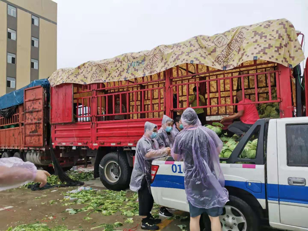 14:30,天空開始飄起雨點(diǎn),大家依舊堅(jiān)守在各自的崗位上,很快雨點(diǎn)就打濕了衣服和頭發(fā),可現(xiàn)場(chǎng)沒有一個(gè)人退下躲雨。“這車卸得差不多了,我們?nèi)ツ沁厧兔Α保摆踅瓍^(qū)轉(zhuǎn)運(yùn)蔬菜的車來了,需要10個(gè)人裝車”,“我去”“我也去”,現(xiàn)場(chǎng)只有時(shí)不時(shí)這樣的聲音傳來。
