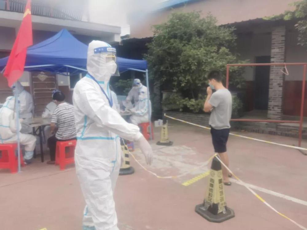 其間有部分群眾因排隊(duì)時(shí)間長而情緒激動,沖到隊(duì)員面前詢問、質(zhì)問,甚至有人脫下口罩??申?duì)員們沒有退開,即使知道可能危險(xiǎn)就在身邊,他們勇敢地站在群眾中間,用手掌充當(dāng)擴(kuò)音器,大聲地向群眾解釋,安撫大家情緒,規(guī)勸他們戴好口罩、保持距離。最終,志愿者的真誠付出打動了在場的居民,大家依次排隊(duì)有序完成了核酸檢測工作。