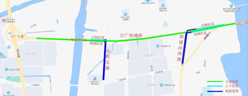 江廣快速路西起江廣互通,東至萬福大橋,均為新建,全長3.152公里,雙向六車道、時(shí)速80公里,在沙灣北路及京杭北路設(shè)置2對平行式匝道。此次開通路段為江廣快速路全線高架及平行匝道,通過江廣快速路可快捷連通運(yùn)河快速路與萬福大橋,形成連接江都區(qū)與廣陵區(qū)的快速通道,同時(shí)方便市民至揚(yáng)州東站乘坐高鐵出行。從萬福大橋或運(yùn)河快速路進(jìn)入江廣快速路的車輛也可以通過新建沙灣路或者京杭北路設(shè)置的上下匝道口進(jìn)入萬福西路。
