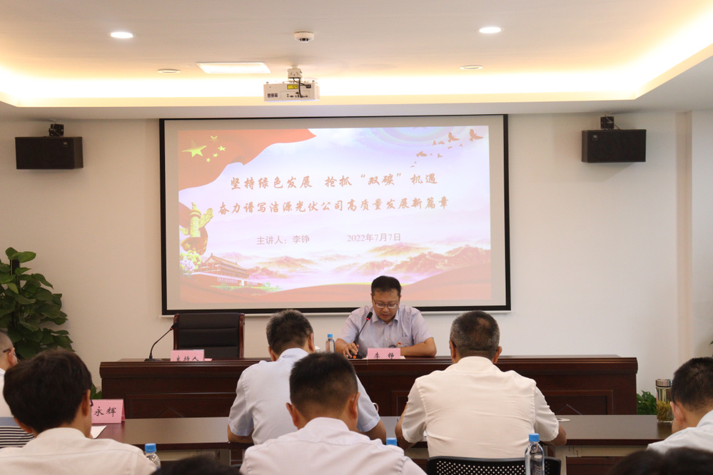 李錚以《堅持綠色發(fā)展、搶抓“雙碳”機遇,奮力譜寫潔源光伏公司高質量發(fā)展新篇章》為題,從“把綠色發(fā)展的底色鋪好,必須深刻領會抓內涵”“把綠色發(fā)展的底色鋪好,必須共謀共建強理念”“把綠色發(fā)展的底色鋪好,必須履職盡責抓落實”三個方面闡述了綠色發(fā)展的重要意義,分析了“雙碳”目標背景下新能源產業(yè)的發(fā)展機遇,并對潔源光伏公司下一步工作提出了具體要求。