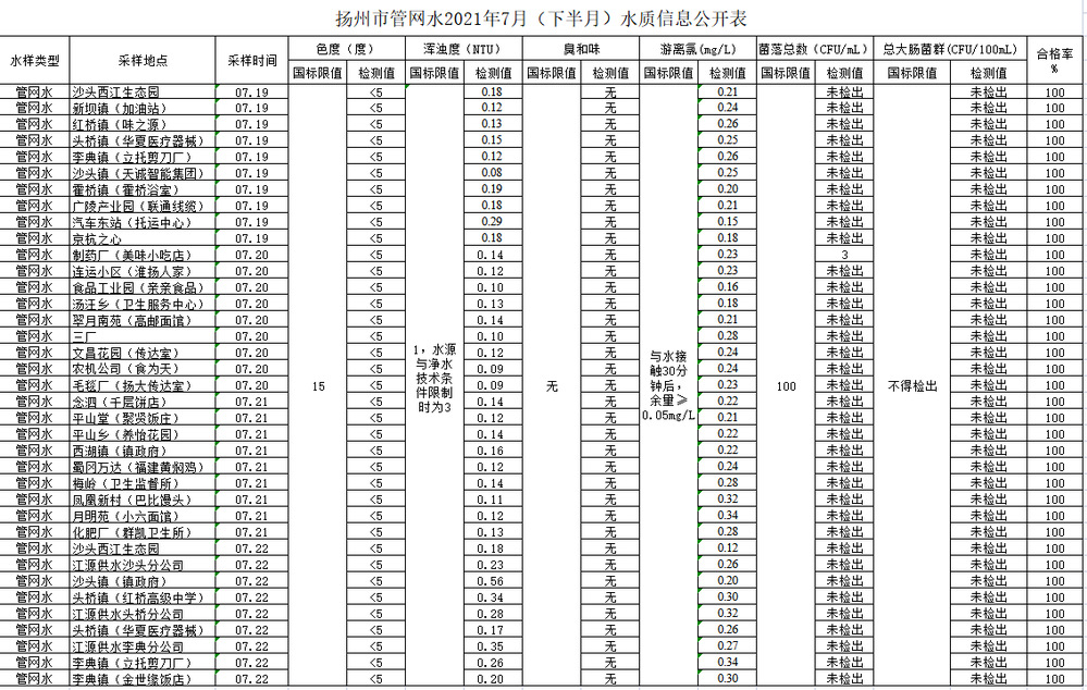 揚(yáng)州市管網(wǎng)水2021年7月(下半月)水質(zhì)信息公開(kāi)表