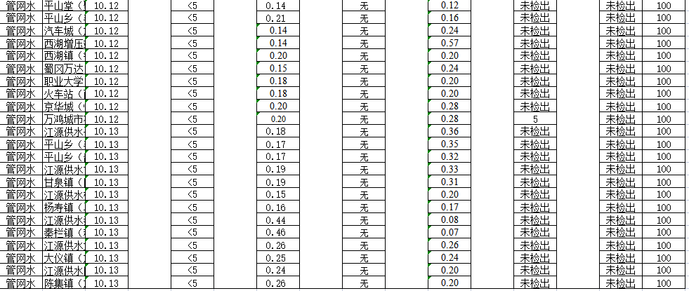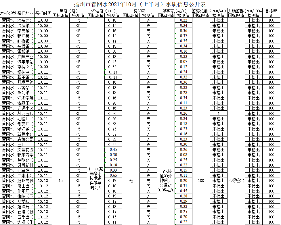 揚(yáng)州市管網(wǎng)水2021年10月(上半月)水質(zhì)信息公開表
