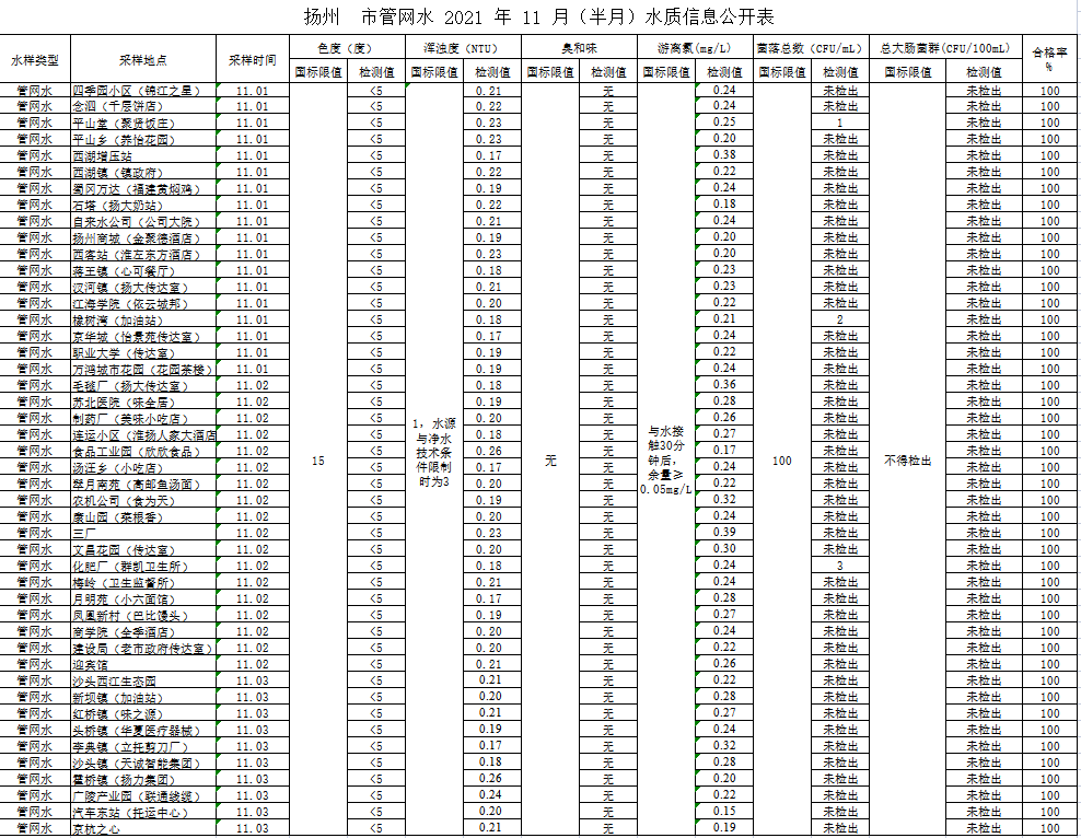 揚(yáng)州市管網(wǎng)水 2021 年 11 月(半月)水質(zhì)信息公開表