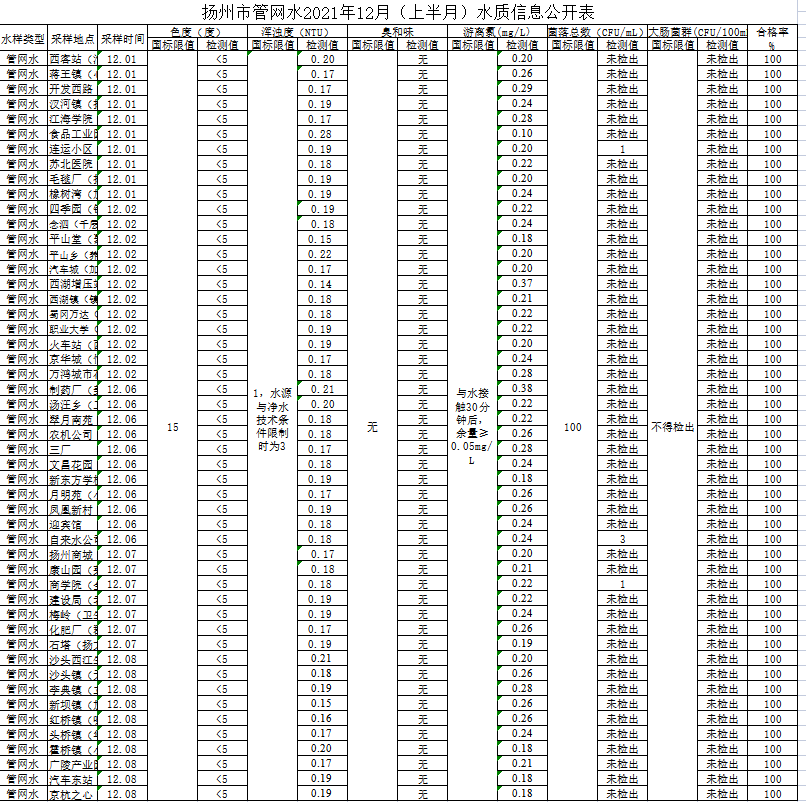 揚(yáng)州市管網(wǎng)水2021年12月(上半月)水質(zhì)信息公開表