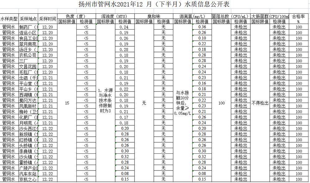 揚(yáng)州市管網(wǎng)水2021年12 月(下半月)水質(zhì)信息公開(kāi)表