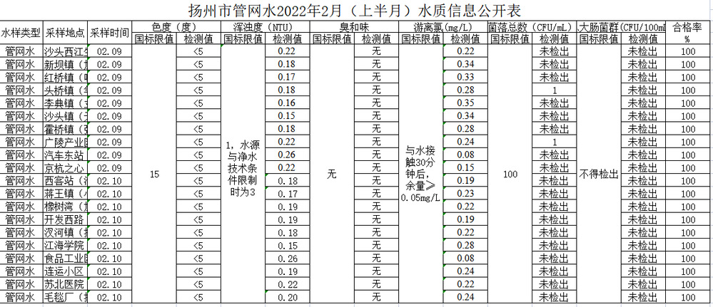 揚州市管網(wǎng)水2022年2月(上半月)水質(zhì)信息公開表