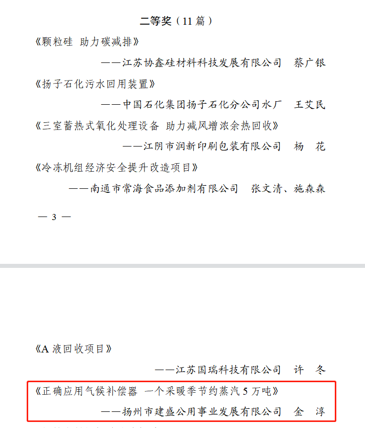 近日,江蘇省勞動競賽委員會發(fā)布《關(guān)于2022年度節(jié)能降碳隨手拍活動的表揚通報》,揚州市建盛公用事業(yè)發(fā)展有限公司金淳同志的作品——《正確應(yīng)用氣候補償器 一個采暖季節(jié)約蒸汽5萬噸》榮獲二等獎。