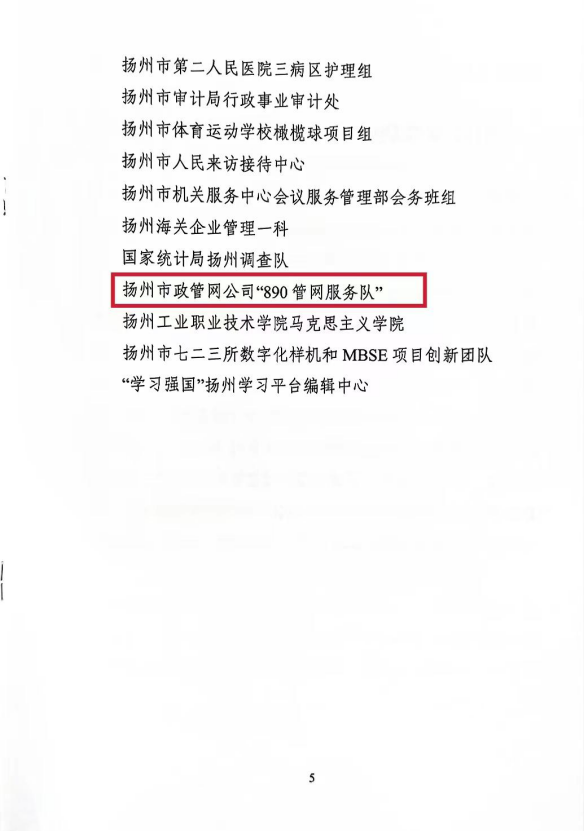 近日,市婦聯(lián)、市婦女“巾幗建功”活動領(lǐng)導(dǎo)小組聯(lián)合表彰了一批揚州市“巾幗文明崗”和“巾幗建功標(biāo)兵”。揚州市政管網(wǎng)有限公司“890管網(wǎng)服務(wù)隊”榮獲“巾幗文明崗”稱號。