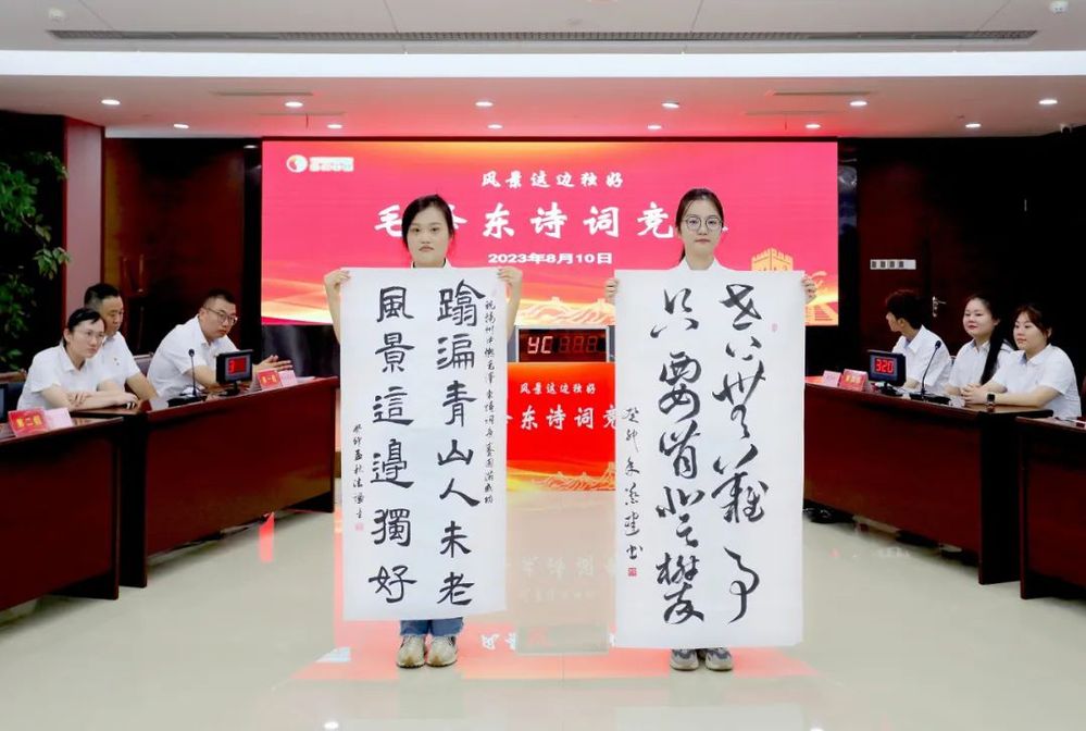 本次活動還穿插了毛澤東詩詞書法作品展示。來自公司的兩位揚州市書法家協(xié)會會員,用行草、隸書體分別書寫了“世上無難事,只要肯登攀”、“踏遍青山人未老,風景這邊獨好”。創(chuàng)作者將毛澤東詩詞融入書法作品,形象、生動、直觀地展現(xiàn)了毛澤東同志不畏困難的壯志豪情和革命樂觀主義精神。