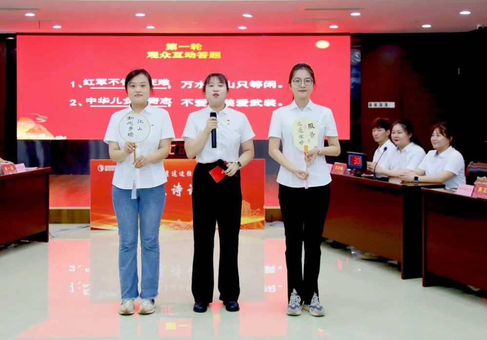 風險題“飛花令”環(huán)節(jié)將競賽推向高潮?!耙粯蝻w架南北,天塹變通途”“赤橙黃綠青藍紫,誰持彩練當空舞?”“裝點此關山,今朝更好看”……各支代表隊你來我往,輪番背誦含有“數(shù)字”、“顏色”、“山”的毛澤東詩詞,選手們進行了一場文化素養(yǎng)與詩詞積累的較量,精彩的接龍不時贏得觀眾的陣陣喝彩。經(jīng)過近兩個小時的激烈角逐,最終第一黨支部代表隊榮獲一等獎、第三黨支部代表隊獲得二等獎、第二黨支部代表隊獲得三等獎。