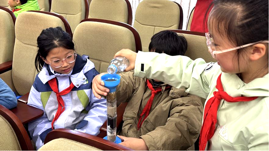 隨著過濾裝置制作完成,小記者們將臟水緩緩倒入過濾器,緊盯著水流經(jīng)過每一層過濾材料,經(jīng)過實(shí)驗(yàn)裝置的處理,原本渾濁的臟水逐漸變得清澈透明?!巴?,水真的變清了!”當(dāng)清澈的水從過濾器底部緩緩流出時(shí),不少同學(xué)驚呼出聲,臉上洋溢著喜悅的笑容?!拔矣X得這個(gè)實(shí)驗(yàn)太神奇了!沒想到經(jīng)過簡單的幾個(gè)步驟,就讓水質(zhì)有了明顯改善。”梅嶺小學(xué)四(10)班的劉同學(xué)激動(dòng)地說道。小記者們紛紛表示,此次科普活動(dòng)不僅讓他們了解了飲用水安全的重要性,還在實(shí)踐中培養(yǎng)了觀察、思考和動(dòng)手的能力。在活動(dòng)的最后,現(xiàn)場進(jìn)行了有獎(jiǎng)問答環(huán)節(jié),小記者們都非常踴躍地回答問題,大家對于制水、凈水、節(jié)水,都有了更加深刻的理解。