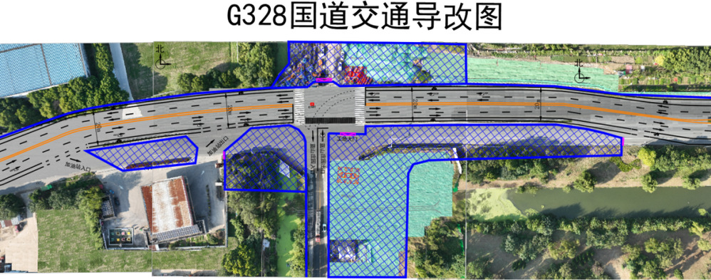 為保障潤揚南路快速化改造工程施工順利進行,確保工程施工期間安全暢通,自2024年12月22日起至2025年4月30日止,對G328國道與潤揚南路交叉口相關路段實施臨時導改,導改道路長度約450米,第一階段導改整體向北平移約9米,維持雙向四車道交通布局,兩端以彎道形式平穩(wěn)順接至既有道路。
