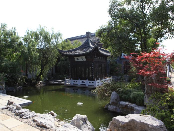 最妙是晨起的時(shí)光。木格窗欞外,賣花人的竹籃里盛著沾露的芍藥,賣藕粉的梆子聲驚醒了檐角的風(fēng)鈴??蜅5牟璨┦坑没⑴苋蓍_綠楊春,茶煙裊裊中,隔墻飄來評彈的弦索叮咚,不知是哪間客房的客人,正跟著《茉莉花》的唱詞輕叩桌板。