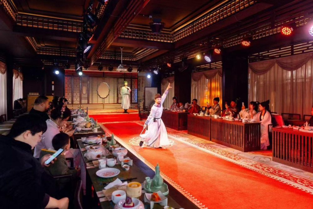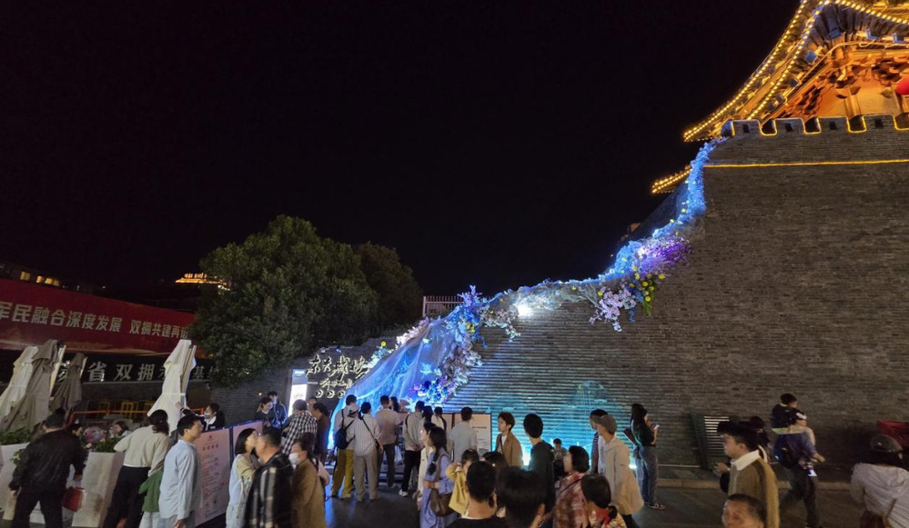從謝馥春香粉店旁的“淮揚(yáng)早茶體驗(yàn)區(qū)”到街尾的“老字號(hào)美食長(zhǎng)廊”,街區(qū)串聯(lián)起揚(yáng)州美食文化精髓。三和四美醬園現(xiàn)場(chǎng)熬制“櫻花腐乳”,將傳統(tǒng)工藝與春日風(fēng)物融合;揚(yáng)大酸奶、漢森熊啤酒等網(wǎng)紅美食與霸王茶姬國(guó)風(fēng)茶飲形成混搭風(fēng)潮,滿足年輕群體的多元需求。夜經(jīng)濟(jì)版圖持續(xù)拓展:芍藥園子書(shū)場(chǎng)評(píng)話聲聲入耳,長(zhǎng)樂(lè)鹽商宴再現(xiàn)鹽商雅集盛景,形成日賞非遺、夜享雅韻的全時(shí)段體驗(yàn)閉環(huán)。數(shù)字科技為古街注入新活力,街區(qū)東門城樓引入VR全景漫游、AI互動(dòng)等前沿技術(shù),在東關(guān)城樓打造《創(chuàng)世·山海經(jīng)》沉浸式數(shù)字文化展,吸引約3000名游客穿越上古神話世界,虛實(shí)相生的光影藝術(shù)讓傳統(tǒng)文化煥發(fā)時(shí)尚魅力。