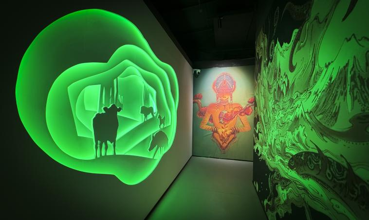 展館以《山海經(jīng)》中記載的128只奇異神獸為核心,通過數(shù)字雕塑、全息投影、交互裝置等前沿技術(shù),將古籍中的文字轉(zhuǎn)化為可感知的立體奇觀。比翼鳥展翅時羽翼流光溢彩,狍鸮(饕餮)的咆哮聲震耳欲聾,帝江的混沌之舞在光影中若隱若現(xiàn)……18個主題展廳猶如18個平行時空,其中最令人驚艷的“四季”展廳,只需佩戴特制眼鏡,便能親歷春日百花綻于指尖、冬雪紛飛沾衣欲濕的四季流轉(zhuǎn)。