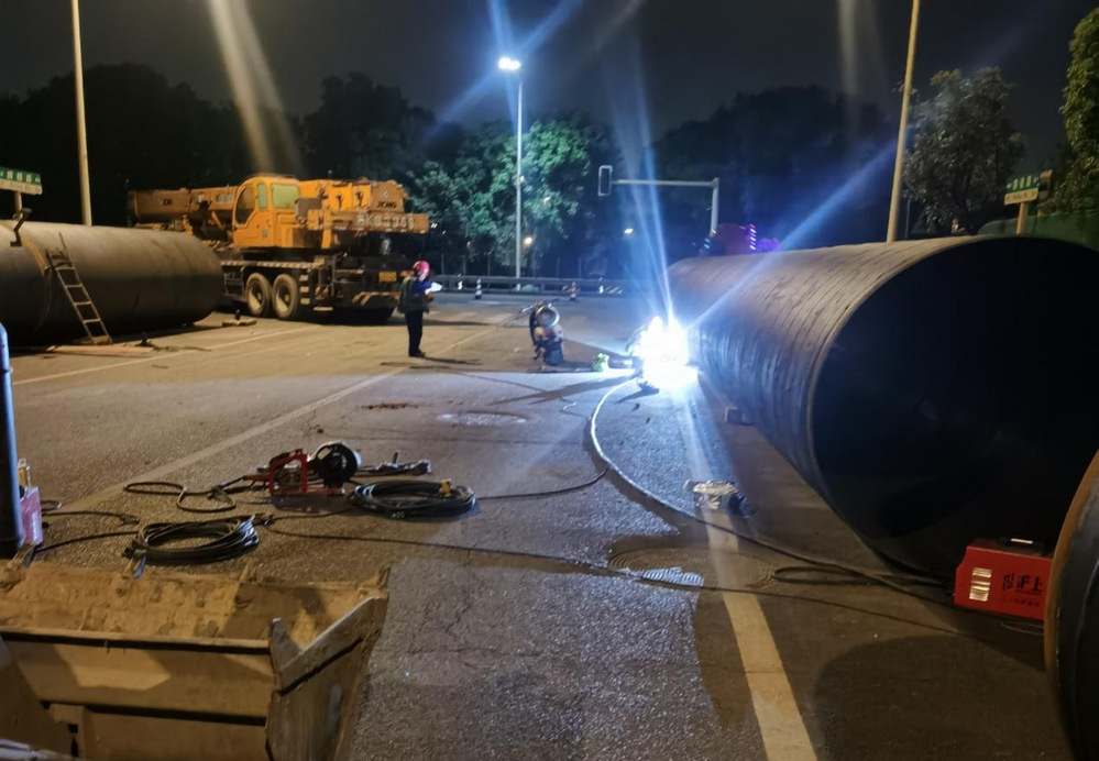 在管道焊接環(huán)節(jié),本項目DN1800污水管道采用雙管敷設,DN2000鋼套管內嵌DN1800污水管,創(chuàng)新采用“地面預制+整體吊裝”工藝,將15米雙管在地面焊接成型后,由兩臺50噸吊車協(xié)同作業(yè)精準下放。為確保零滲漏,項目團隊在雙管間隙注入高壓水泥漿,形成雙重密封,噴淋系統(tǒng)、霧炮車全天候抑塵,基坑積水即時抽排,有力實現(xiàn)了揚塵不擴散、泥水不外流。