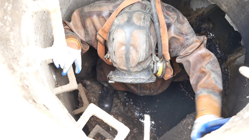 對于井室和管道內(nèi)存在的大塊水泥和混凝土,常規(guī)方法難以清除,只能通過人工下井清掏。穿上厚重的防護服、戴上防毒面具、系好安全繩,相榮慢慢降入井中。管道內(nèi)悶熱潮濕、空氣混濁?!熬聹囟缺鹊孛孢€高,像蒸桑拿。”在直徑僅700mm的井室內(nèi),相榮用風鎬將水泥塊打碎,并用小桶將打碎的水泥碎塊裝進去,再由井上面的輔助人員一桶一桶的拎上來,并及時裝入垃圾袋,當天集中清運。經(jīng)過兩個小時的奮戰(zhàn),他們終于疏通了這段兩米多長的堵塞管道。當相榮被上面兩個輔助人員通過三腳架及安全繩拉上來時,汗水濕透了他的衣服。