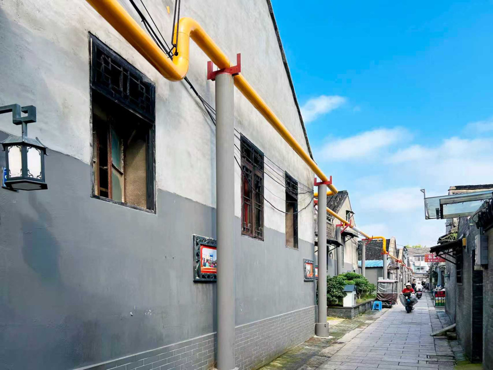 該方案通過精心設(shè)計(jì)與計(jì)算,在無(wú)法沿墻敷設(shè)管道的狹窄空間內(nèi),采用設(shè)立專用鋼結(jié)構(gòu)立柱的方式,將燃?xì)夤艿婪€(wěn)固地架設(shè)起來(lái),如同為管道建造了“空中走廊”。這一方法有效規(guī)避了老建筑墻體承重不足、巷道過窄等限制,既保障了管道的安全穩(wěn)固,又最大程度減少了對(duì)原有建筑結(jié)構(gòu)和街巷風(fēng)貌的影響。