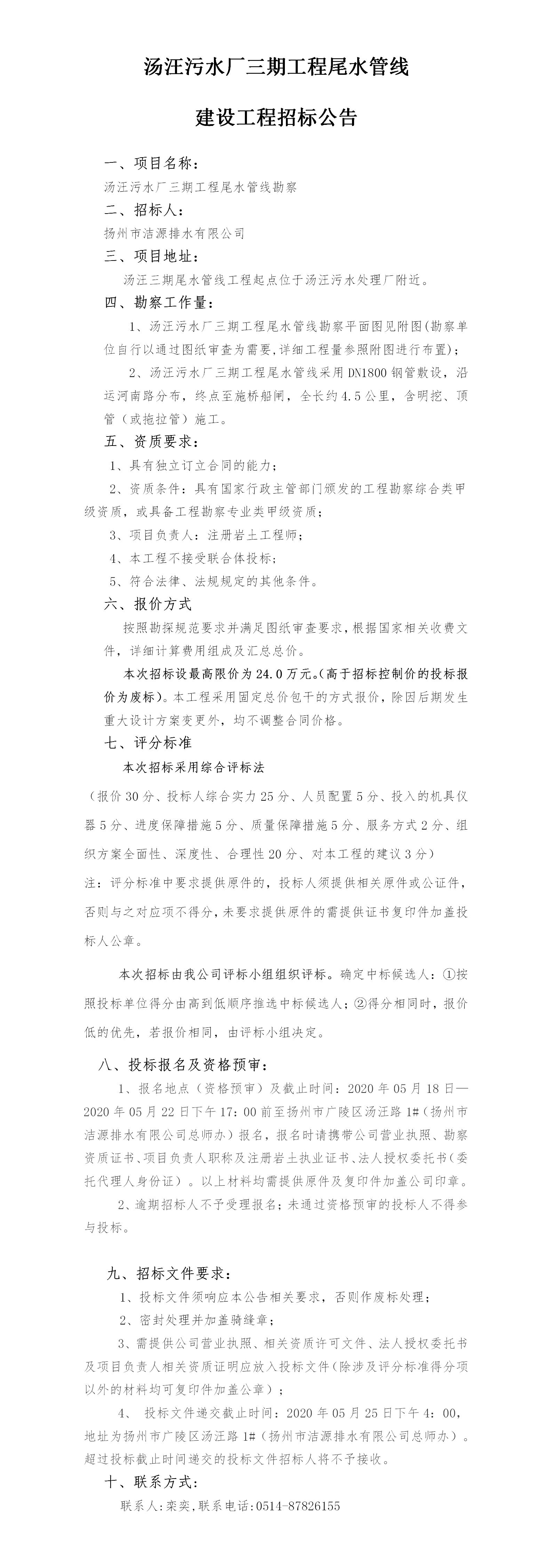 湯汪污水廠三期工程尾水管線建設工程招標公告
