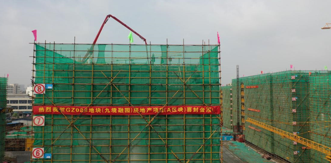 9月18日一早,九境融園項(xiàng)目施工現(xiàn)場萬里晴空、惠風(fēng)和暢,寫著“熱烈祝賀GZ088地塊(九境融園)房地產(chǎn)項(xiàng)目(A區(qū)塊)喜封金頂”字樣的橫幅格外閃耀。伴隨著3、5號樓屋面頂板混凝土澆筑,在建設(shè)單位、監(jiān)理單位及施工單位的共同見證下,九境融園項(xiàng)目A區(qū)塊工程正式完成全部主體結(jié)構(gòu)的封頂。
