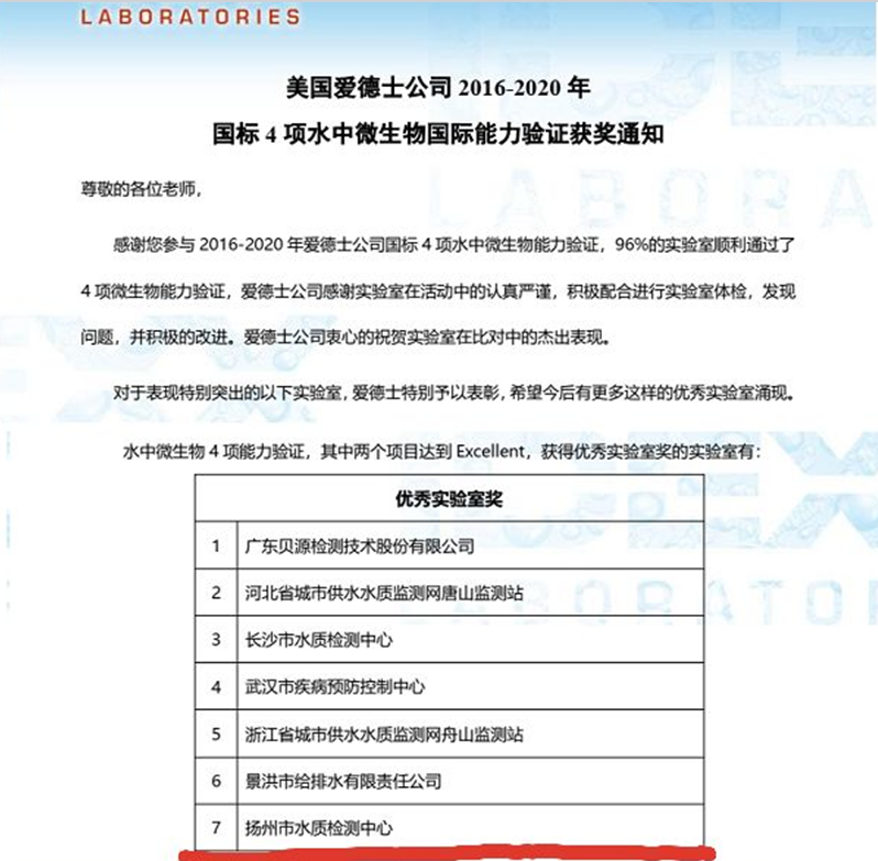 水質(zhì)檢測(cè)中心作為具有CMA資質(zhì)的檢測(cè)機(jī)構(gòu),為保證檢測(cè)能力的持續(xù)穩(wěn)定,確保檢測(cè)數(shù)據(jù)的準(zhǔn)確可靠,積極參加各項(xiàng)能力驗(yàn)證活動(dòng),通過(guò)參加各種考核代替日常訓(xùn)練,促進(jìn)檢測(cè)人員的技能提升。2020年,水質(zhì)檢測(cè)中心共參加國(guó)家認(rèn)監(jiān)委、國(guó)家建設(shè)部等機(jī)構(gòu)組織的能力驗(yàn)證項(xiàng)目14個(gè)參數(shù),均取得滿(mǎn)意結(jié)果。水質(zhì)中心檢測(cè)能力的提升,有力保障了水廠(chǎng)安全優(yōu)質(zhì)供水,為千萬(wàn)用戶(hù)的安全用水保駕護(hù)航。鏈接——美國(guó)愛(ài)德士公司是獲得國(guó)際認(rèn)證的標(biāo)準(zhǔn)物質(zhì)生產(chǎn)者,同時(shí)也是能力驗(yàn)證提供者。愛(ài)德士公司的標(biāo)準(zhǔn)物質(zhì)以及能力驗(yàn)證是CANS(中國(guó)合格評(píng)定國(guó)家認(rèn)可委員會(huì),是國(guó)內(nèi)唯一一家進(jìn)行實(shí)驗(yàn)室認(rèn)可的權(quán)威組織機(jī)構(gòu))承認(rèn)的合格供應(yīng)商。 獲此殊榮,充分證明江蘇長(zhǎng)江水務(wù)股份有限公司對(duì)水中微生物的檢測(cè)能力達(dá)到了一個(gè)國(guó)際認(rèn)可的較高水平,同時(shí)也促進(jìn)檢測(cè)技術(shù)人員的能力和水平得到了更大的提升。