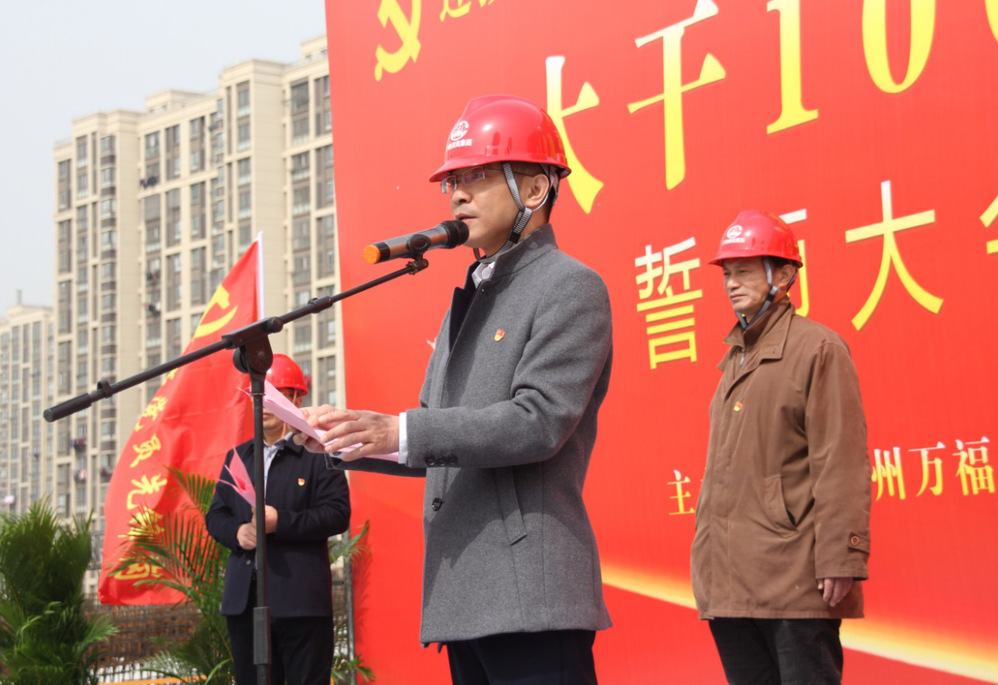 “大干100天,獻禮100周年”勞動競賽將以建設(shè)管理為主線,以質(zhì)量創(chuàng)優(yōu)為核心,以安全生產(chǎn)為重點,以確保工期為目標,以創(chuàng)新創(chuàng)效為動力,以項目黨建為引領(lǐng),在確保施工安全和工程質(zhì)量的前提下,主要圍繞“安全生產(chǎn)、工程質(zhì)量、工程管理、創(chuàng)新創(chuàng)效、廉潔自律、項目文化及疫情防控七個方面開展?;顒又?,各參建單位進行了莊嚴的宣誓,參加活動的領(lǐng)導(dǎo)為“黨員先鋒隊”“青年突擊隊”進行了授旗,萬福公司及參賽單位負責(zé)人作了表態(tài)發(fā)言,市總工會勞經(jīng)部部長賀光明、城控集團黨委副書記徐飛在活動中作了動員講話。