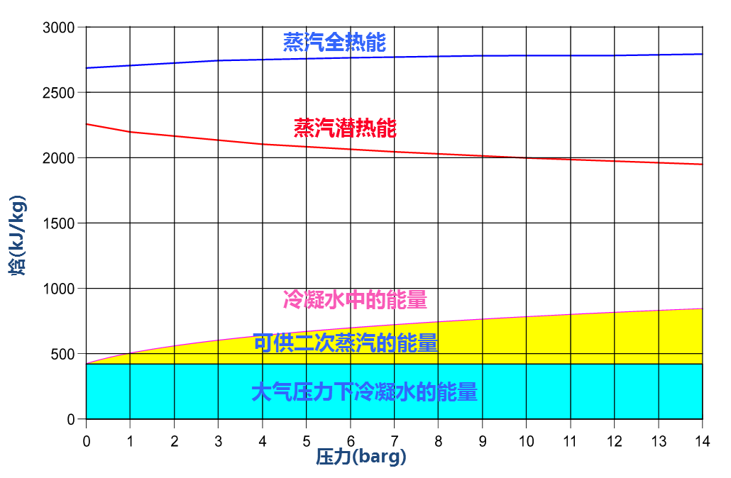 冷凝水所含有的高熱量,回收可實現(xiàn)節(jié)能、降低蒸汽消耗,如下圖黃色部分即為可回收利用的熱量: