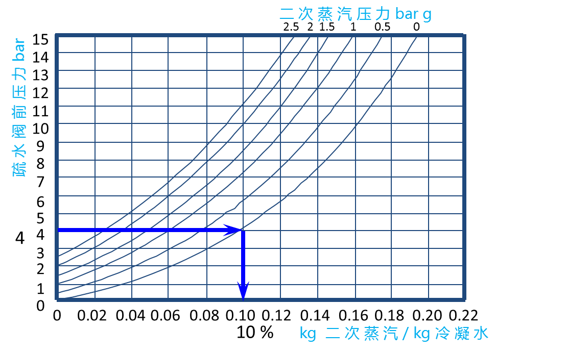 冷凝水壓力越大,二次蒸汽壓力越低,可回收利用的熱能就越多,如下圖可知,當(dāng)冷凝水壓力(及疏水閥前壓力)達(dá)到4bar,二次蒸汽壓力為大氣壓時,閃蒸率為10%:
