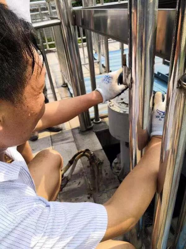中午12點,太陽猛烈,揚州第四水廠機電班李軍在沉淀池進行設(shè)備巡檢維修,此時他曬成了“大紅臉”,汗如雨下?!懊刻煲路撓聛矶寄軘Q出水,至少要換洗2套工作服?!崩钴娦χ蛉さ?,設(shè)備維修馬虎不得,哪怕是擰緊松動的一顆螺絲、解決一絲絲的滲油,都有可能避免一場安全事故?!案邷靥旃ぷ鞔_實難熬,但能確保水廠的生產(chǎn)運轉(zhuǎn),辛苦點也很值得。”