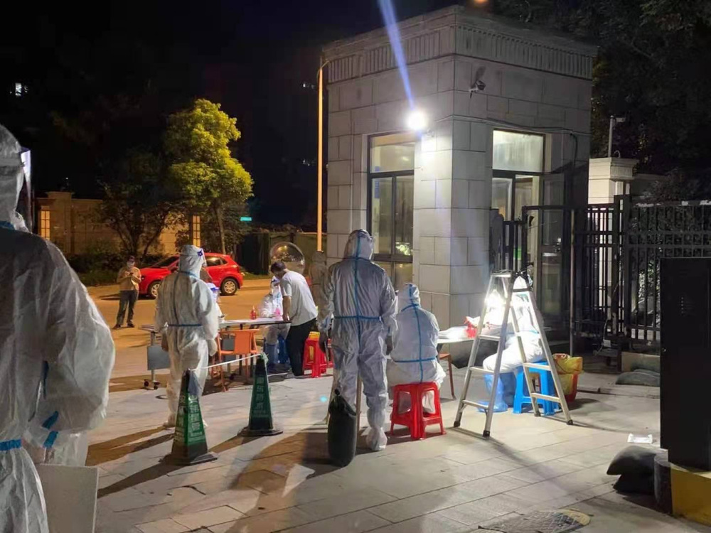 同時(shí),小區(qū)內(nèi)的物業(yè)工作人員在白天做好物資派送的同時(shí),又全力協(xié)助社區(qū)連夜做好了南區(qū)第三次核酸檢測、信息登記、測量體溫、維持好現(xiàn)場秩序,提醒業(yè)主做好個(gè)人防護(hù),保持一米距離排好隊(duì)伍,確保業(yè)主安全完成檢測。