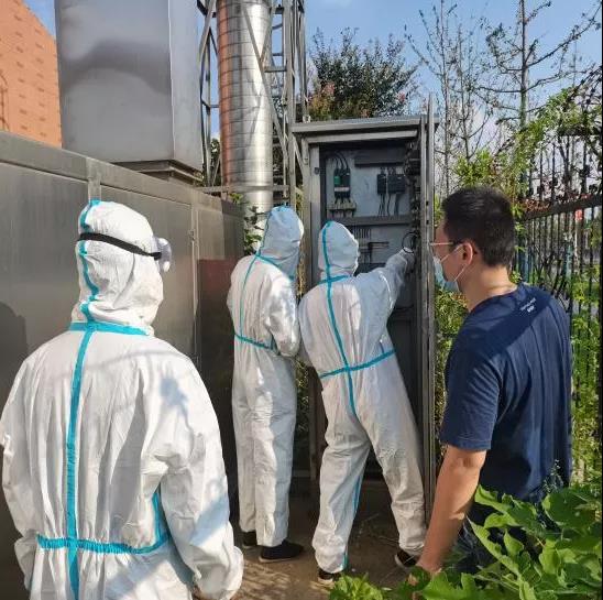 疫情期間,儀揚河泵站除臭設(shè)備突發(fā)故障,為防止異味散發(fā),影響公共環(huán)境,公司第一時間組織保供預備隊維修人員進行了設(shè)備搶修。在全面防護并做好氣體檢測的前提下,維修人員及時排查出故障,烈日下連續(xù)工作不停歇完成了搶修任務,確保了泵站周圍環(huán)境環(huán)保、健康、安全。