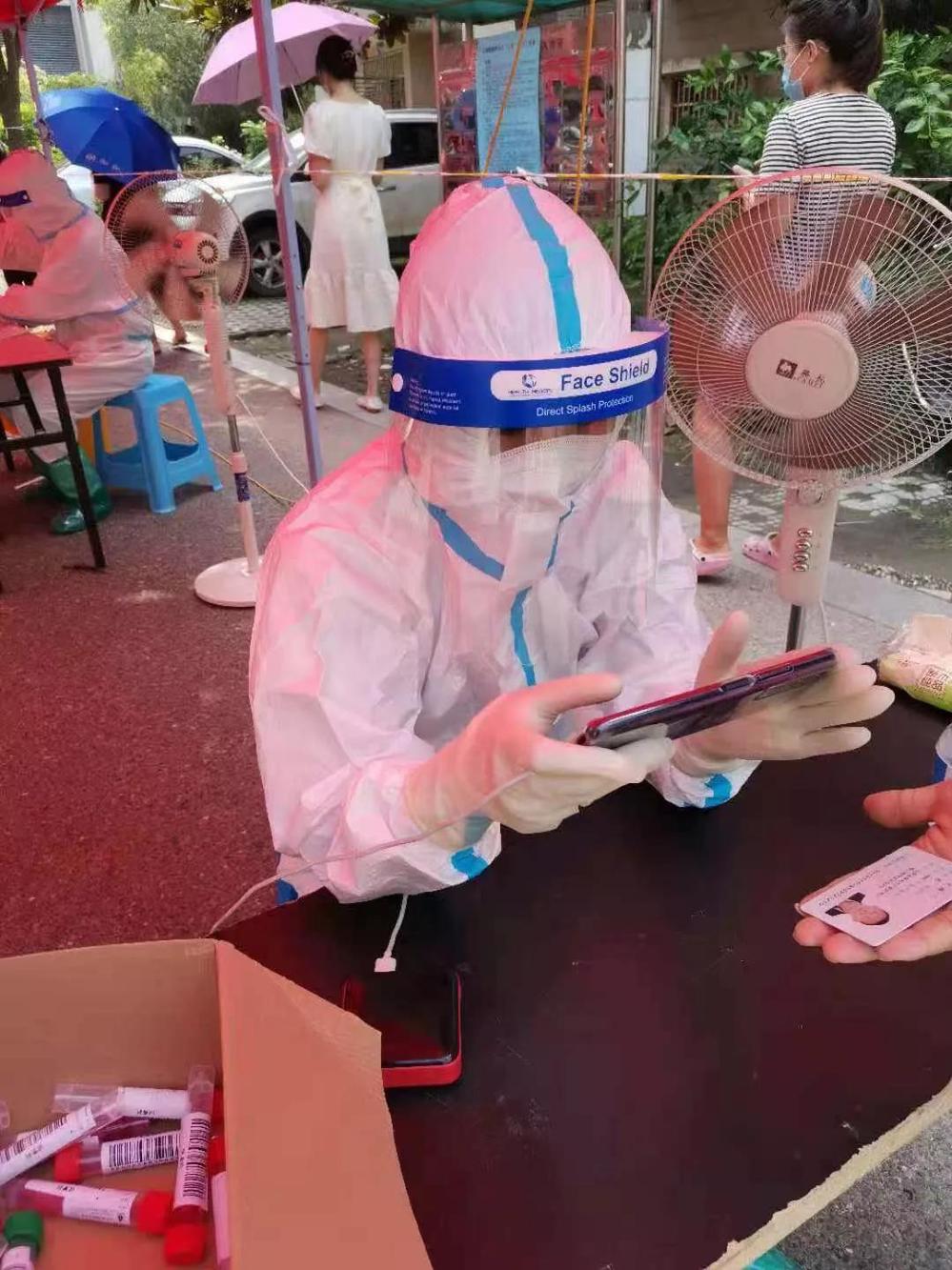 “女兒,我雖然已經(jīng)五十幾歲了,但是我還能出一份力的!”穿上紅馬甲的葛德林很自信?!鞍职?,一位年過半百的人都能有這么高的覺悟,作為年輕人的我也不能掉隊(duì)呀!”葛愛婷下定決心要做好志愿服務(wù)工作,葛愛婷是供水服務(wù)大廳的收費(fèi)員,平時(shí)與數(shù)字?jǐn)?shù)據(jù)打交道比較多,于是她成了核酸檢測(cè)數(shù)據(jù)信息采錄人員。她把年紀(jì)尚小的兩個(gè)小孩都丟給家人照顧,在經(jīng)過疫情防控知識(shí)培訓(xùn)后,每天穿上密不透風(fēng)的防護(hù)服,戴上防護(hù)面罩和手套,成了一名“大白”,負(fù)責(zé)核酸檢測(cè)人員信息采樣登記。驗(yàn)碼、掃描、錄入數(shù)據(jù)……每次核酸檢測(cè)時(shí),這樣的勞動(dòng)數(shù)以萬次,每次她都一絲不茍,深怕出現(xiàn)差錯(cuò),影響檢測(cè)結(jié)果。每天工作十幾個(gè)小時(shí),經(jīng)歷高溫酷暑,渾身濕透毫無怨言。