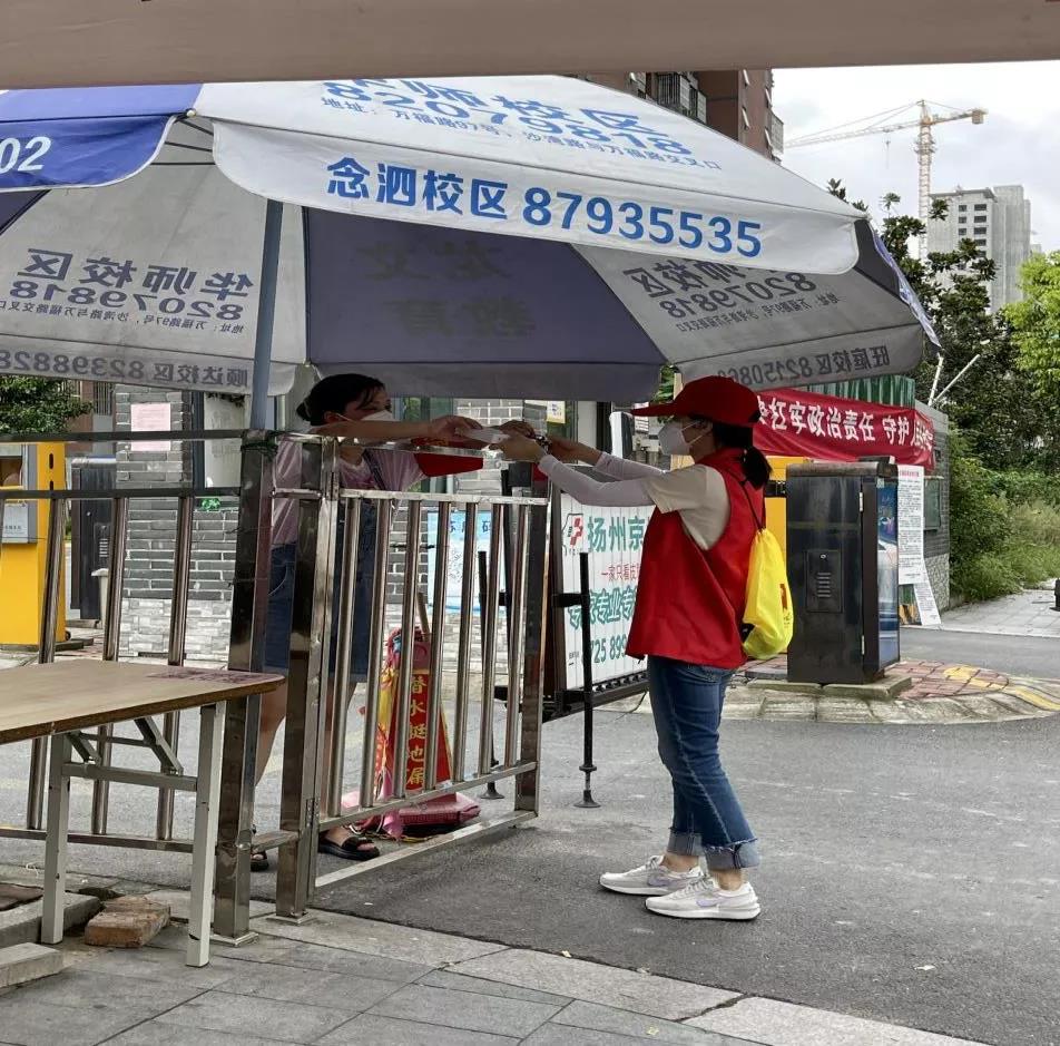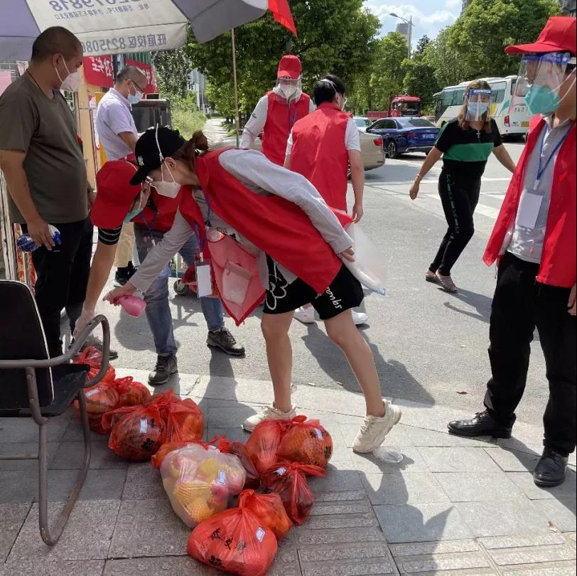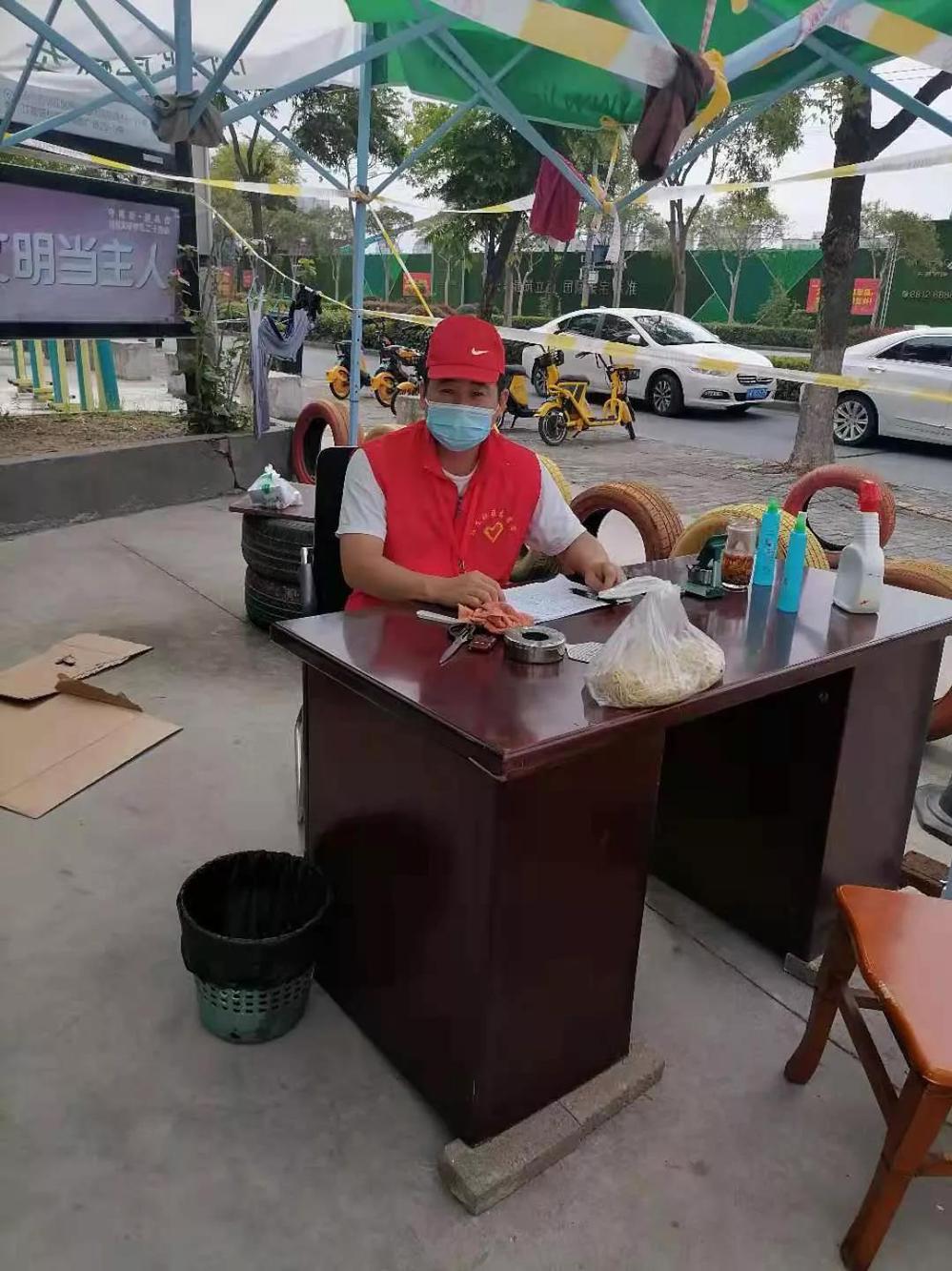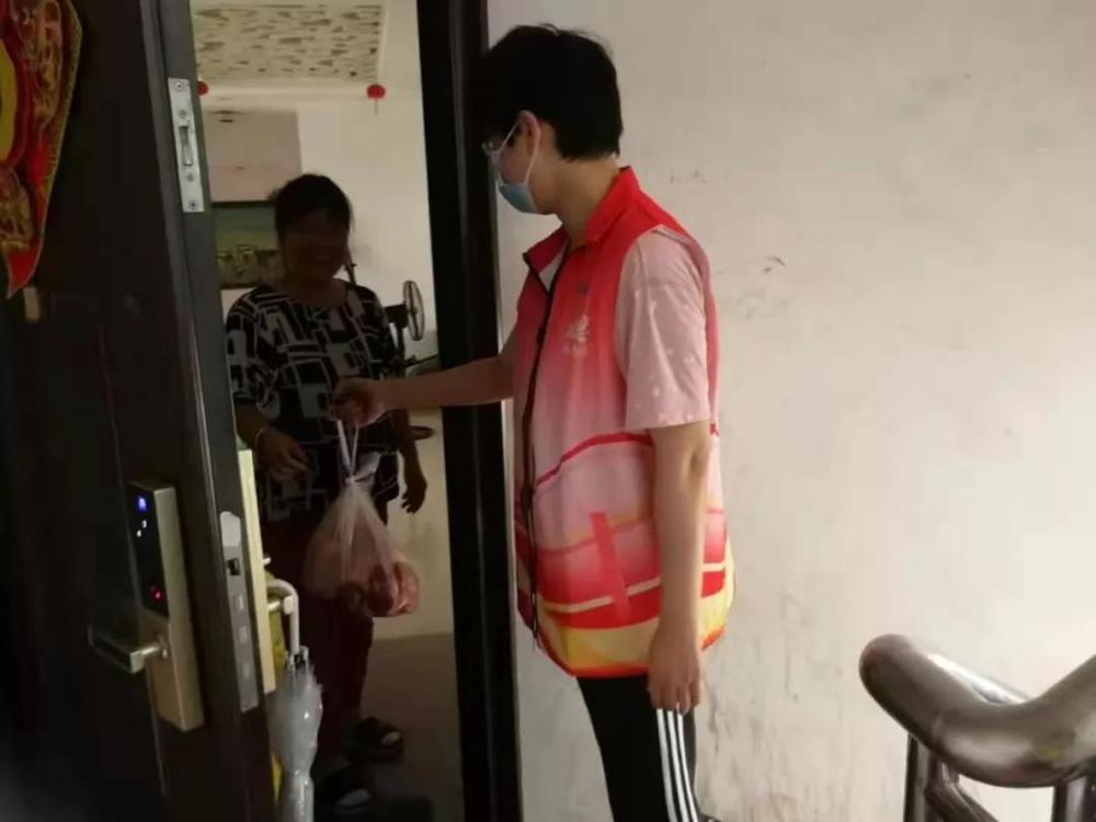 (綜合辦公室周易,在萬福社區(qū)幫助小區(qū)居民進(jìn)行物資幫送,牢記時(shí)刻保持1米線安全距離)